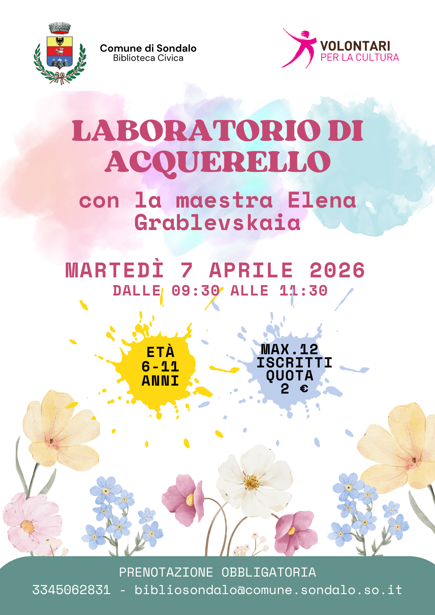 La Biblioteca Civica di Sondalo, con la collaborazione dei Volontari per la Cultura, propone per martedì 7 aprile 2026 dalle ore 9:30 alle ore 11:30 un laboratorio di acquerello con la maestra Elena Grablevskaia.