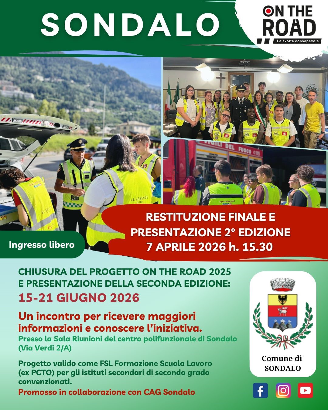 Il Comune di Sondalo e l’associazione ragazzi On the Road, in collaborazione con il CAG Sondalo, invitano tutti i ragazzi e le famiglie alla presentazione della seconda edizione del progetto nazionale “On the Road” 2026, un’importante esperienza di cittadinanza attiva dedicata ai giovani dai 15/16 ai 20 anni.