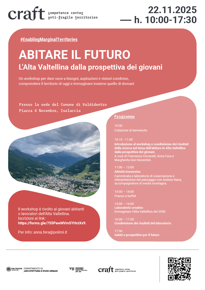 Il laboratorio “Abitare il Futuro: l’Alta Valtellina dalla prospettiva dei giovani” si terrà sabato 22 novembre a Valdidentro. L’iniziativa ha l’obiettivo di creare uno spazio di confronto e immaginazione condivisa sulle prospettive