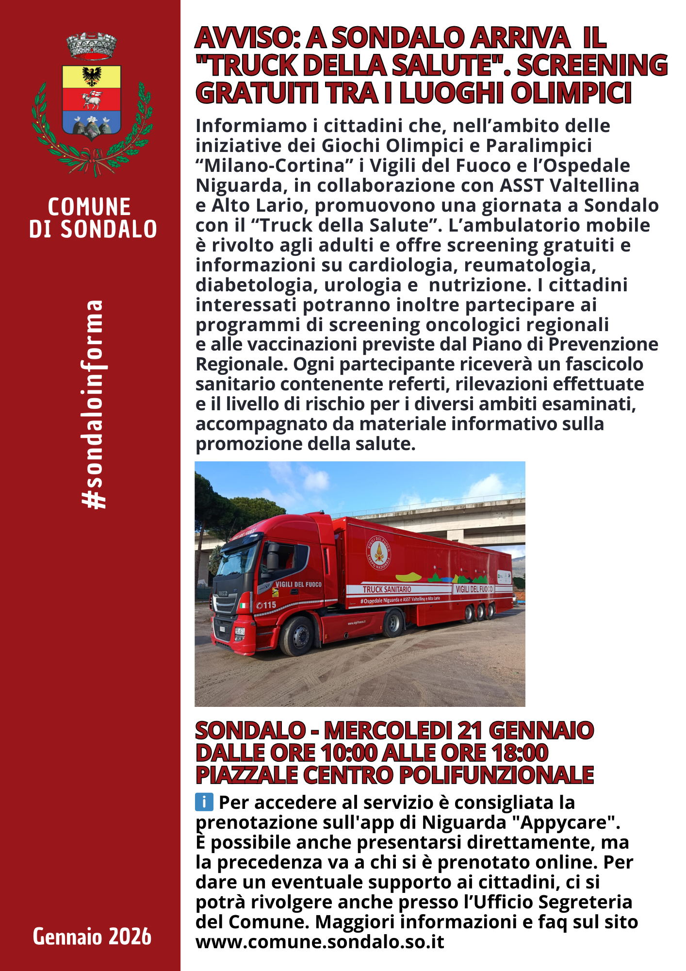 A Sondalo il truck sarà operativo mercoledì 21 gennaio 2026, dalle ore 10 alle ore 16, presso il piazzale del Centro Polifunzionale.